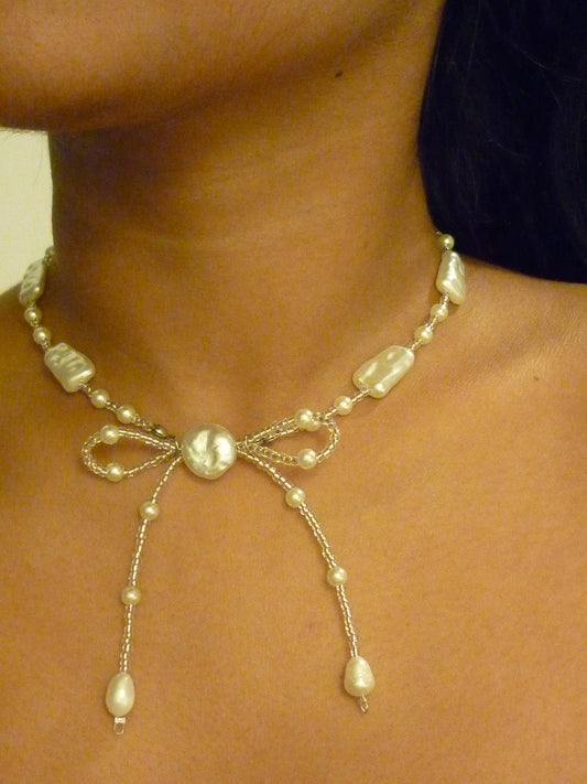 Beaded Bow and Pearls Necklcae